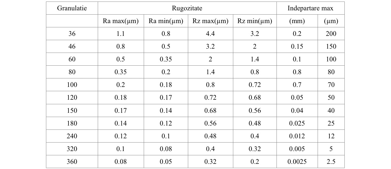 În funcție de alegerea mărimii granulelor, viteza periferica a pietrei precum și de viteza de avans a materialului influenteaza rezultatele finisajului Ra si Rz. Rezultatele reale sunt determinate în funcție de fiecare aplicație. Următorul tabel poate servi drept recomandare pentru alegerea granulatiei la pietrele utilizate la rectificarea fără centre.